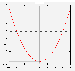 Example 5.Draw the parabola given by the equation y = x2 − 6x. The x-intercepts are (0, 0) and (6, 0). Hence the vertex is situated at x = 6/2 = 3. And y = 32 – 6(3) = -9. The vertex is (3, -9).