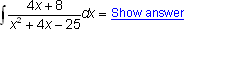 NB. The presence of the derivative as a factor of what is being substituted into an integrand is an essential ingredient of the substitution rule. ExamplesExercisesThe hardest part of the integration is often choosing the right value to substitute. These exercises give practice in choosing u. These exercises are more tricky. Watch out for a common numeric factor in the derivative factor! Now try solving the whole problem. Evaluate the indefinite integrals. QuotientsOne type of problem deserves special mention. The problem appears at first sight as a quotient with larger denominator than numerator rather than as a product of a function raised to the power -1 and its derivative and thus often fools solvers when viewed in isolation: The derivative, f '(x), "disappears like magic". ExamplesBe very careful to check that the numerator is equal to a constant times the derivative of the denominator or this method cannot be used. Example